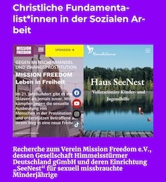 Auch in der 2025 mit Förderung der Freien und Hansestadt Hamburg veröffentlichen Handreichung zu Christlichem Fundamentalismus & Sozialer Arbeit gingen wir auf Mission Freedom und das SeeNest ein. Die Handreichung thematisiert Vorgehensweisen, Strategien und Netzwerke christlich-fundamentalistischer Akteurskonstellationen in der Sozialen Arbeit und ist hier frei abrufbar.